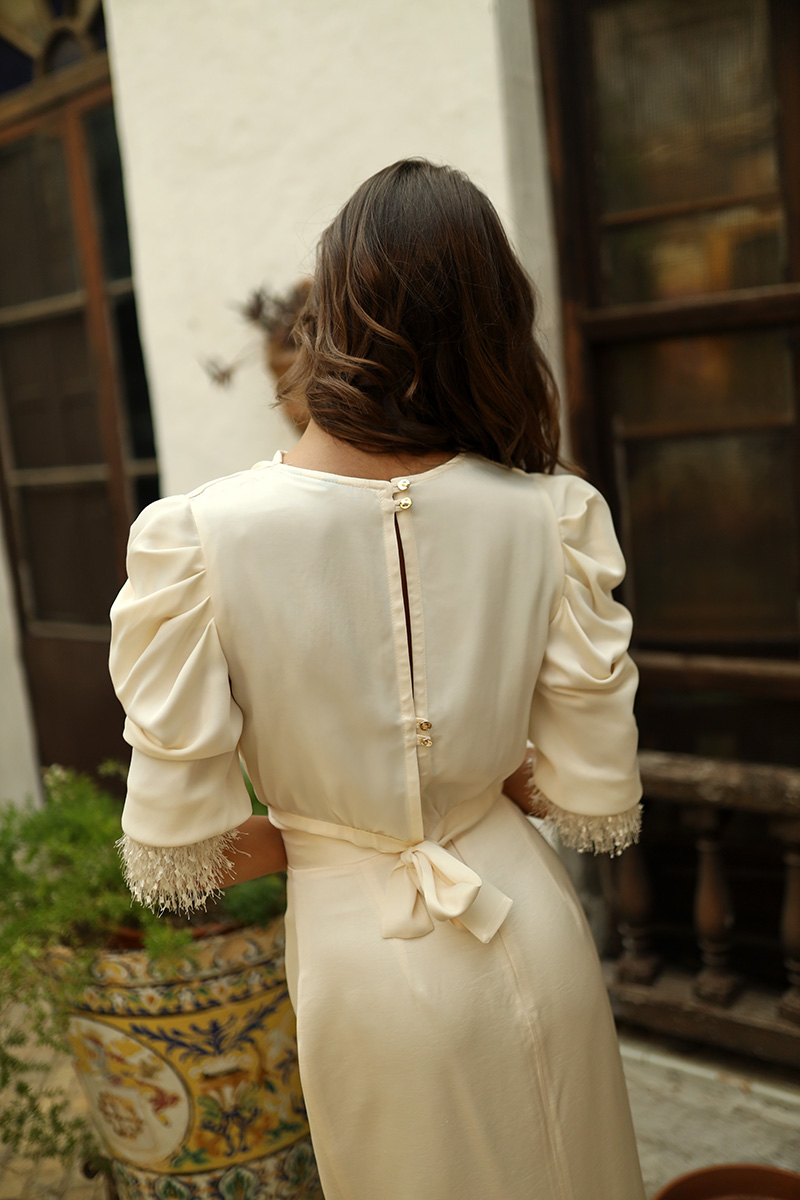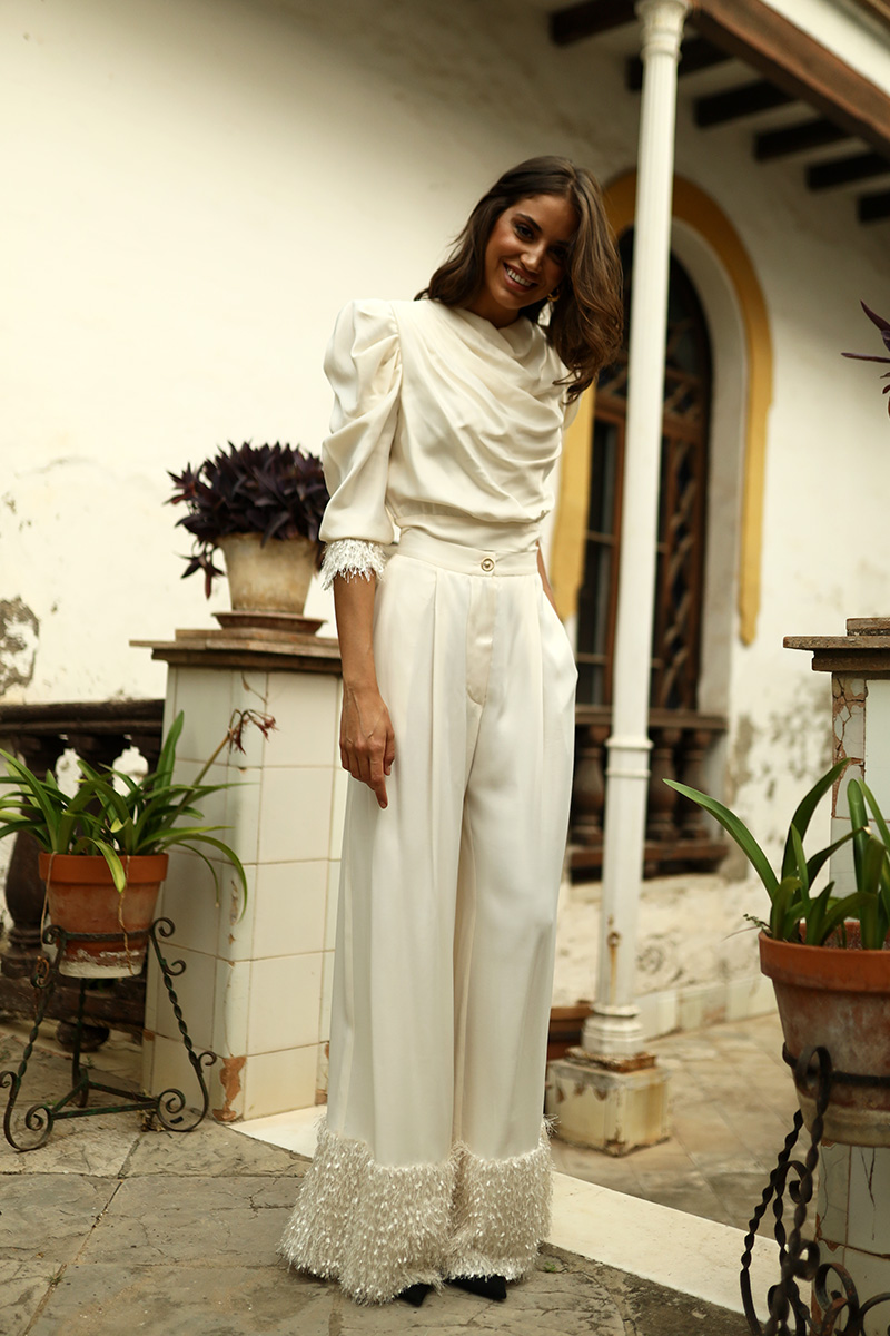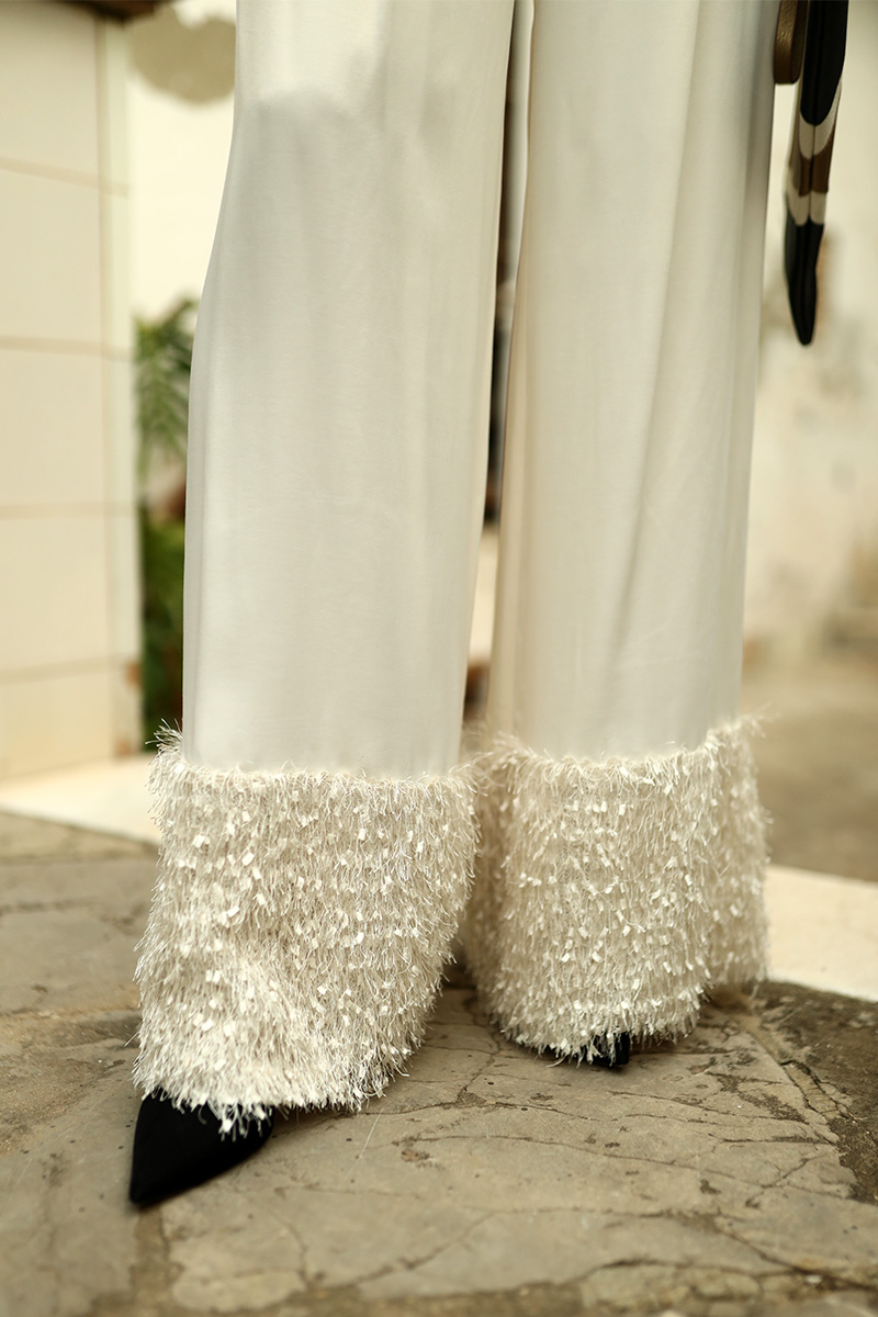 Conjunto de pantalón en blanco muy especial con acabado en flecos simulando plumas.