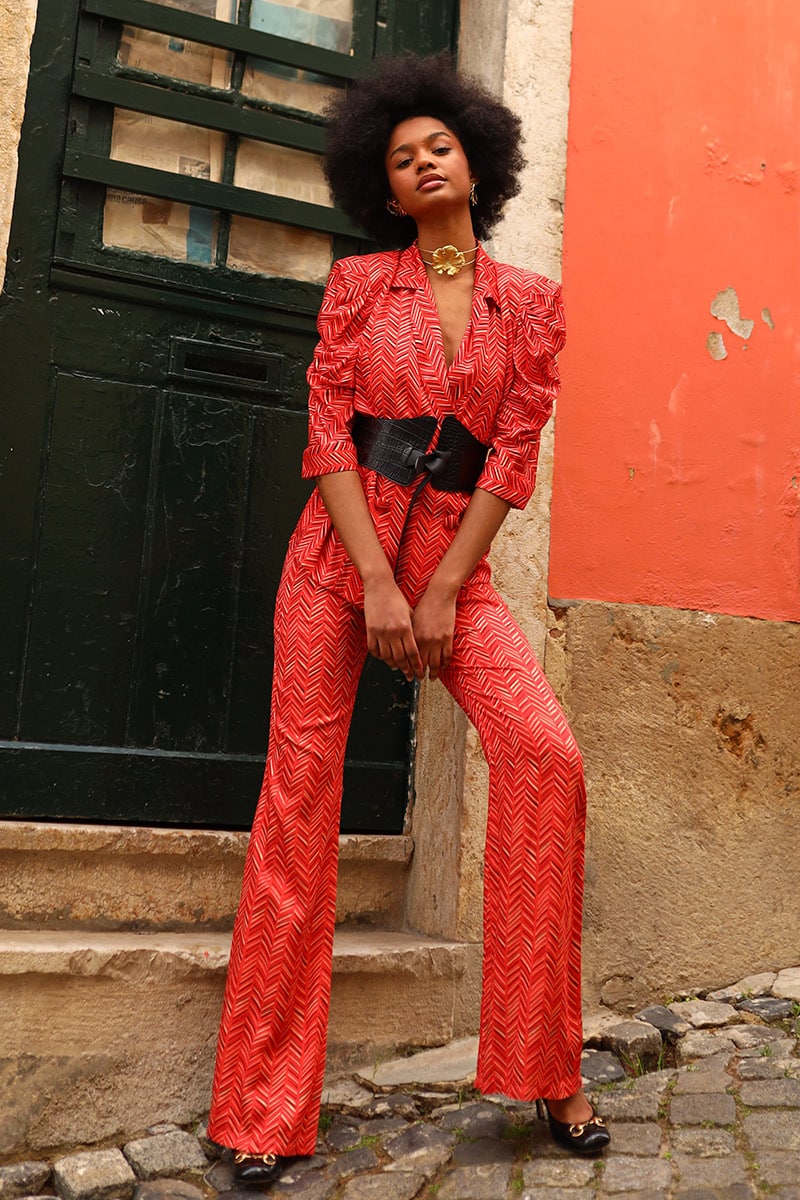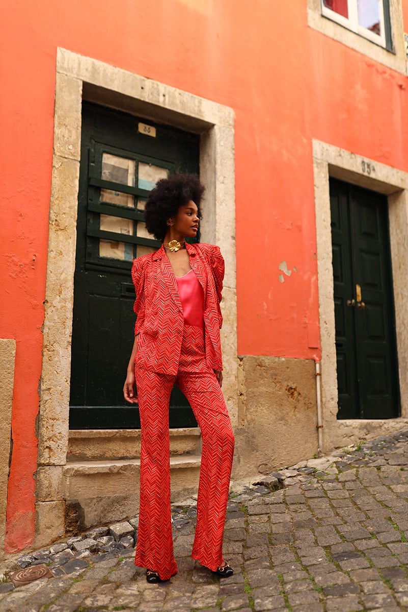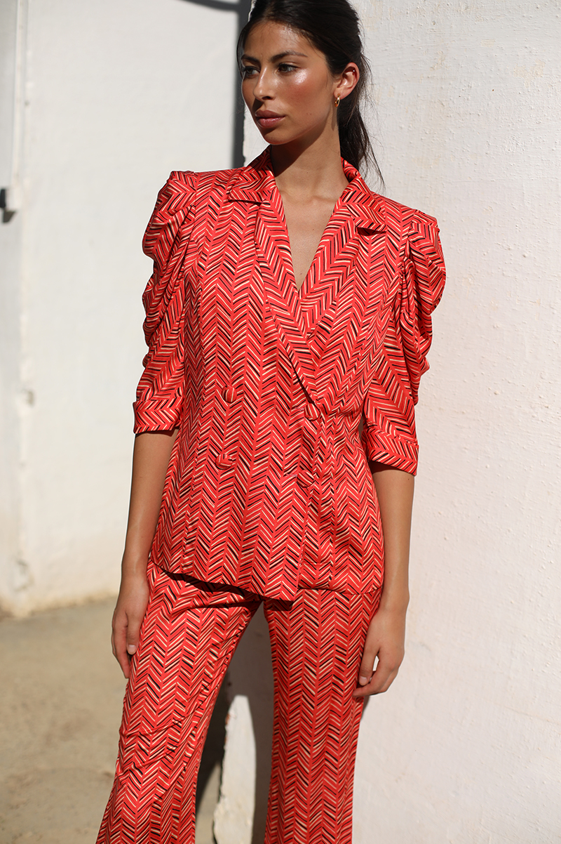 Traje de Chaqueta estampado con fondo naranja actual y divertidísimo que puedes usar en eventos y para un estilo de vestir más casual. No incluye el cinturón de la imagen. Diseñado y confeccionado en España.