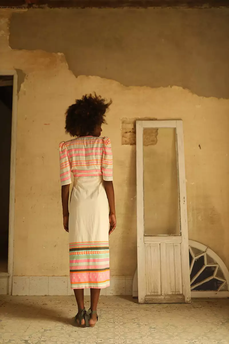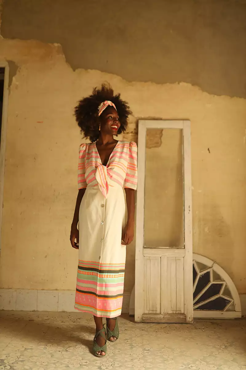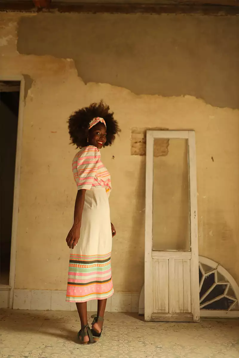 Vestido Vilo es un diseño innovador, con rayas en varios tonos en rosa, naranja, verdes.
