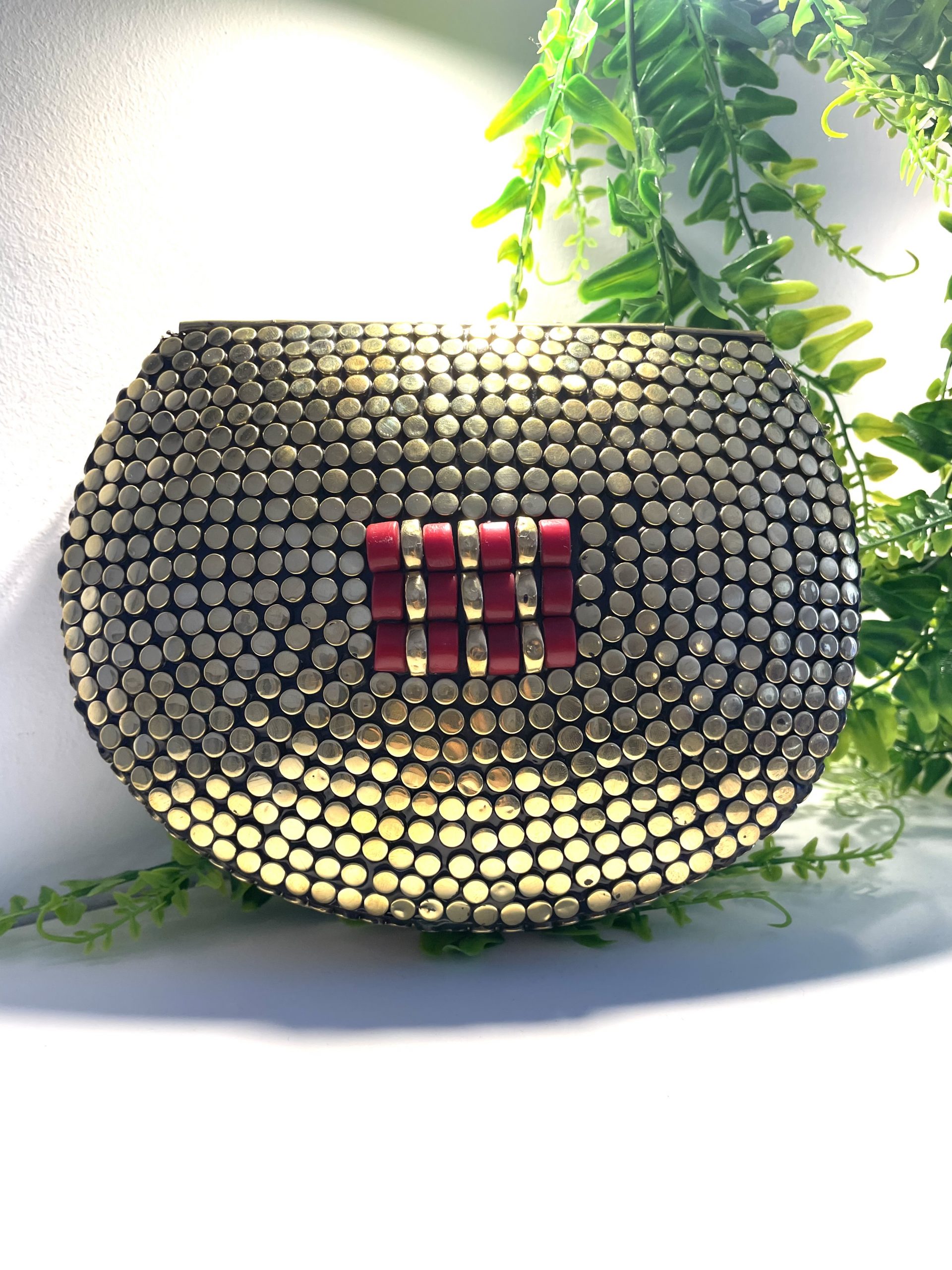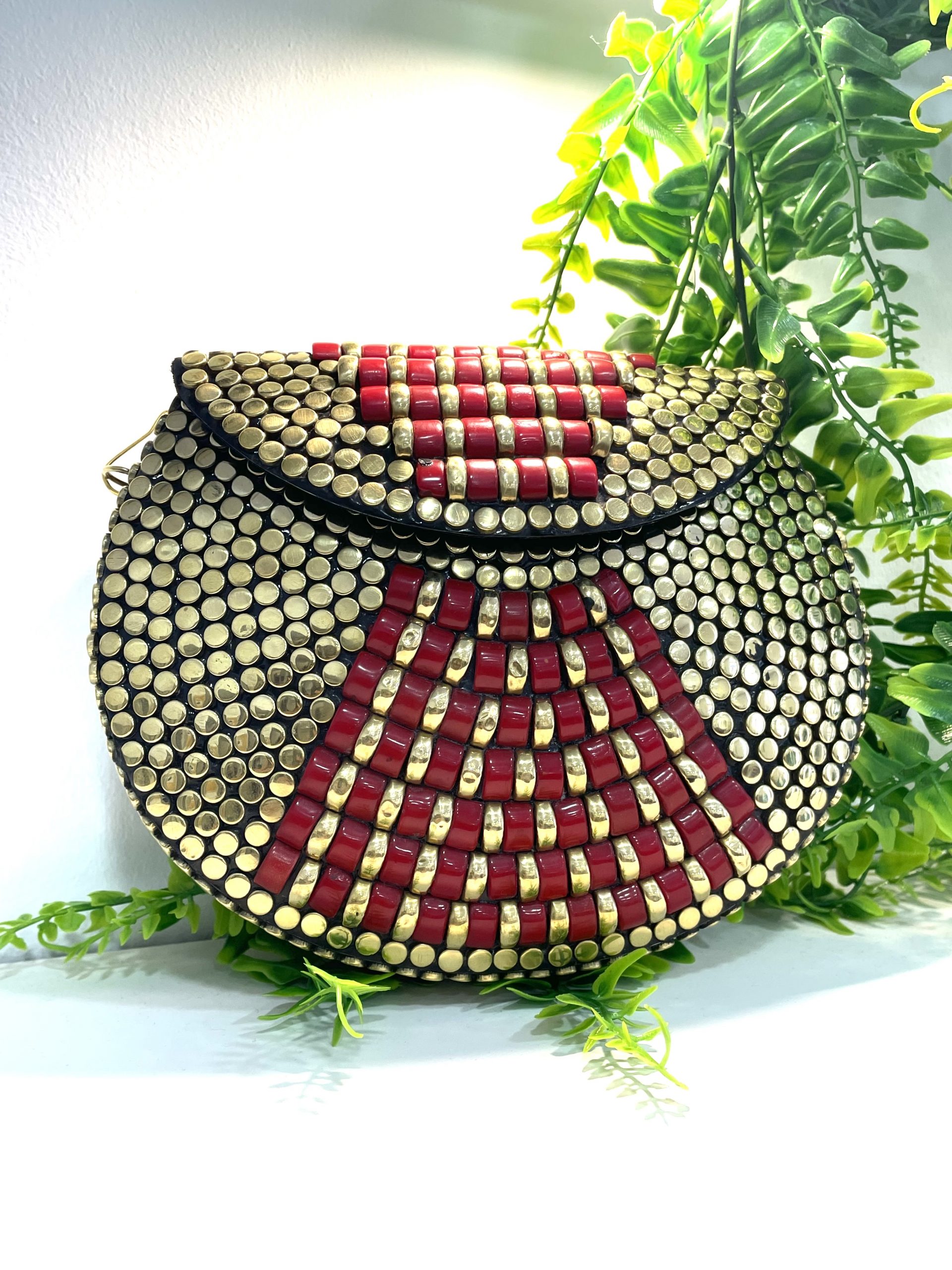 Bolso rígido recubierto de tachuelas doradas y piedras granates, muy original y distintivo para dar un toque muy especial a tu look.