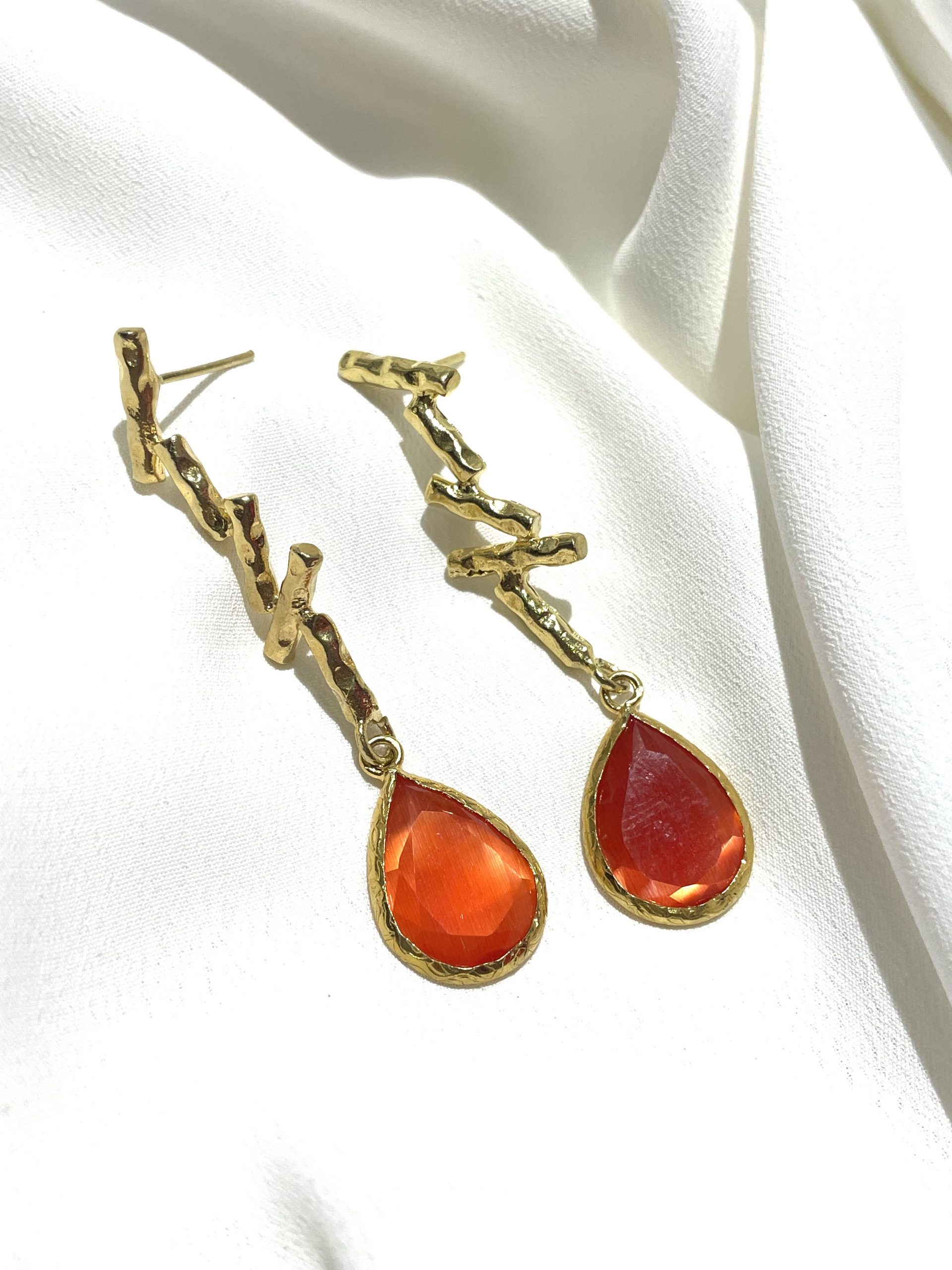 Pendientes alargados dorados con piedra naranja colgando en la parte inferior.