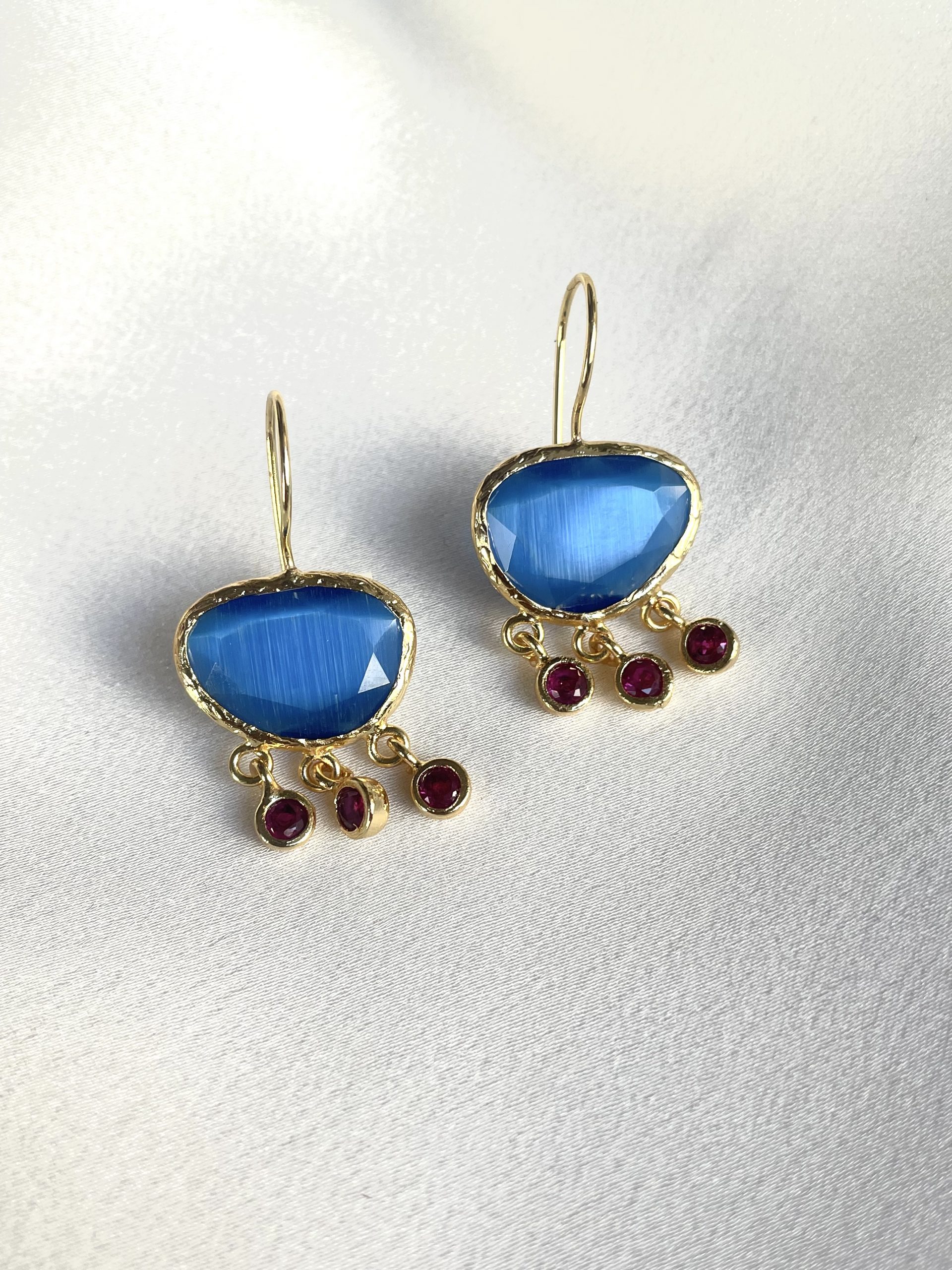 calidad excluviaPendientes dorados con piedra azul y flecos con piedras granates.
