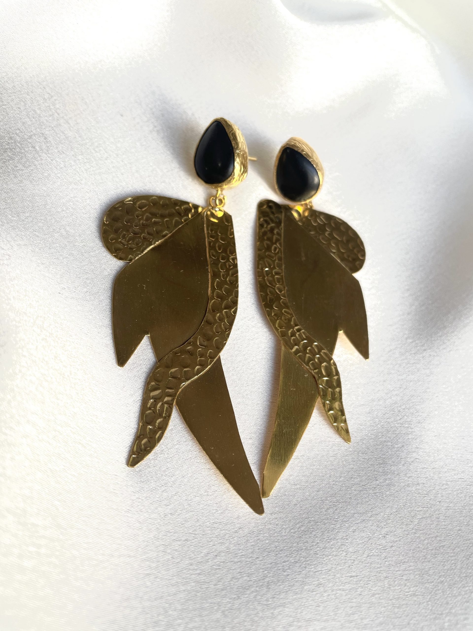 Pendientes largos dorados con detalles texturizados y una piedra negra en forma de gota en la parte superior.