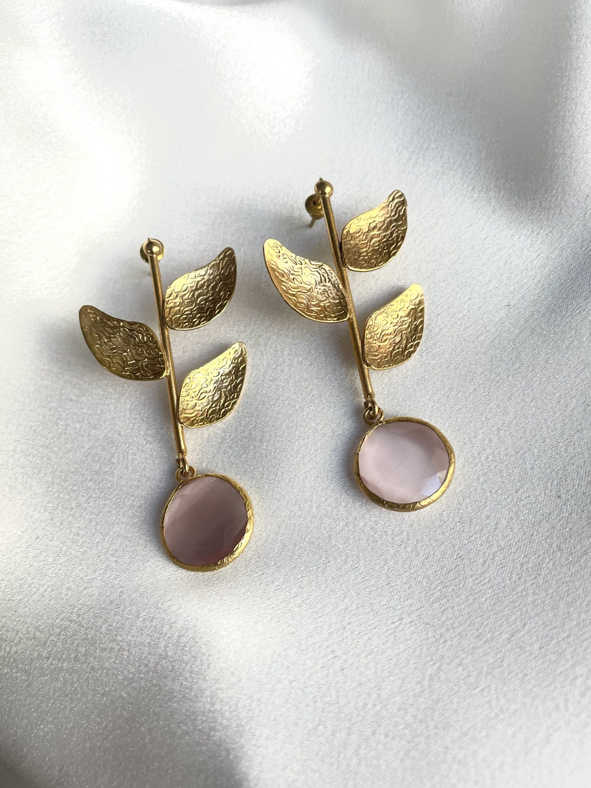 Pendientes dorados largos con hojas a los lados y una piedra rosa clarita en la parte inferior.