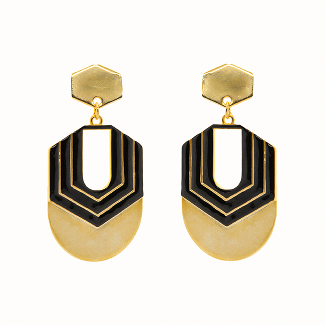 Pendientes con forma hexágono con baño de oro y esmalte color negro.
