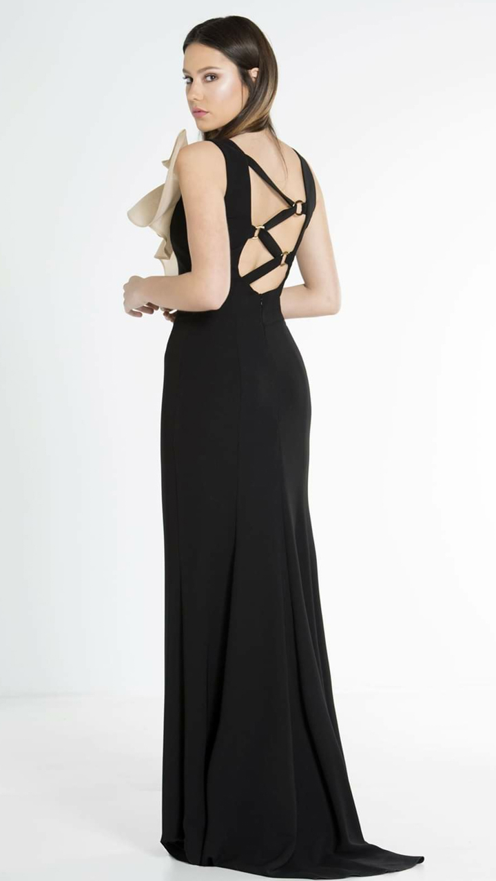 Vestido de corte sirena confeccionado en crep de alta calidad, en tono negro.